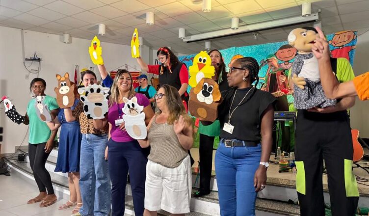 O dia foi marcado por uma apresentação envolvente, que resgatou músicas infantis tradicionais e incentivou os educadores a vivenciarem, na prática, o poder do brincar.